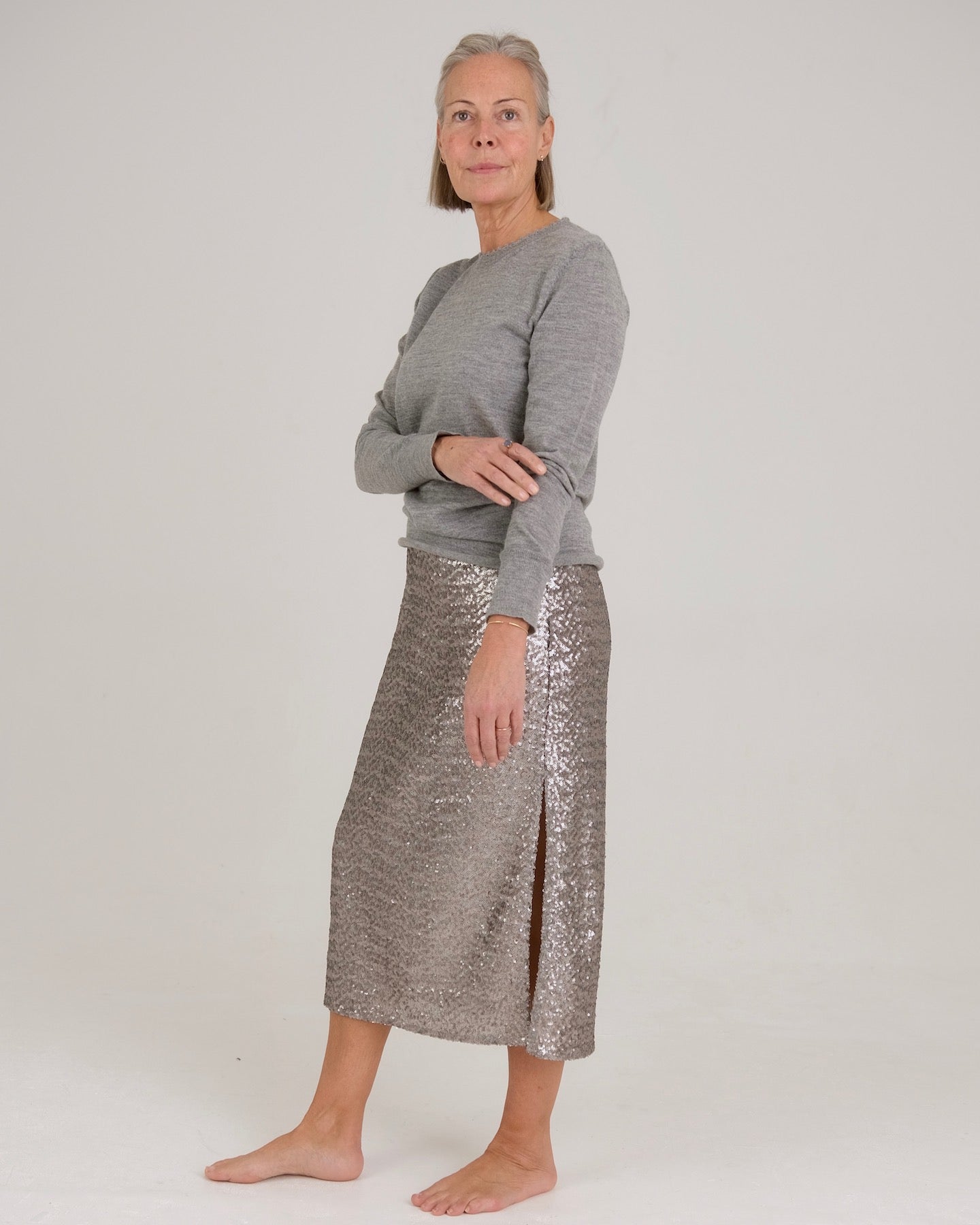 Cut from platinum dead-stock sequins, this sheath skirt s delivers a soft statement. Side splits add ease and movement, while bound seams give the interior a refined finish without loosing any sheerness.