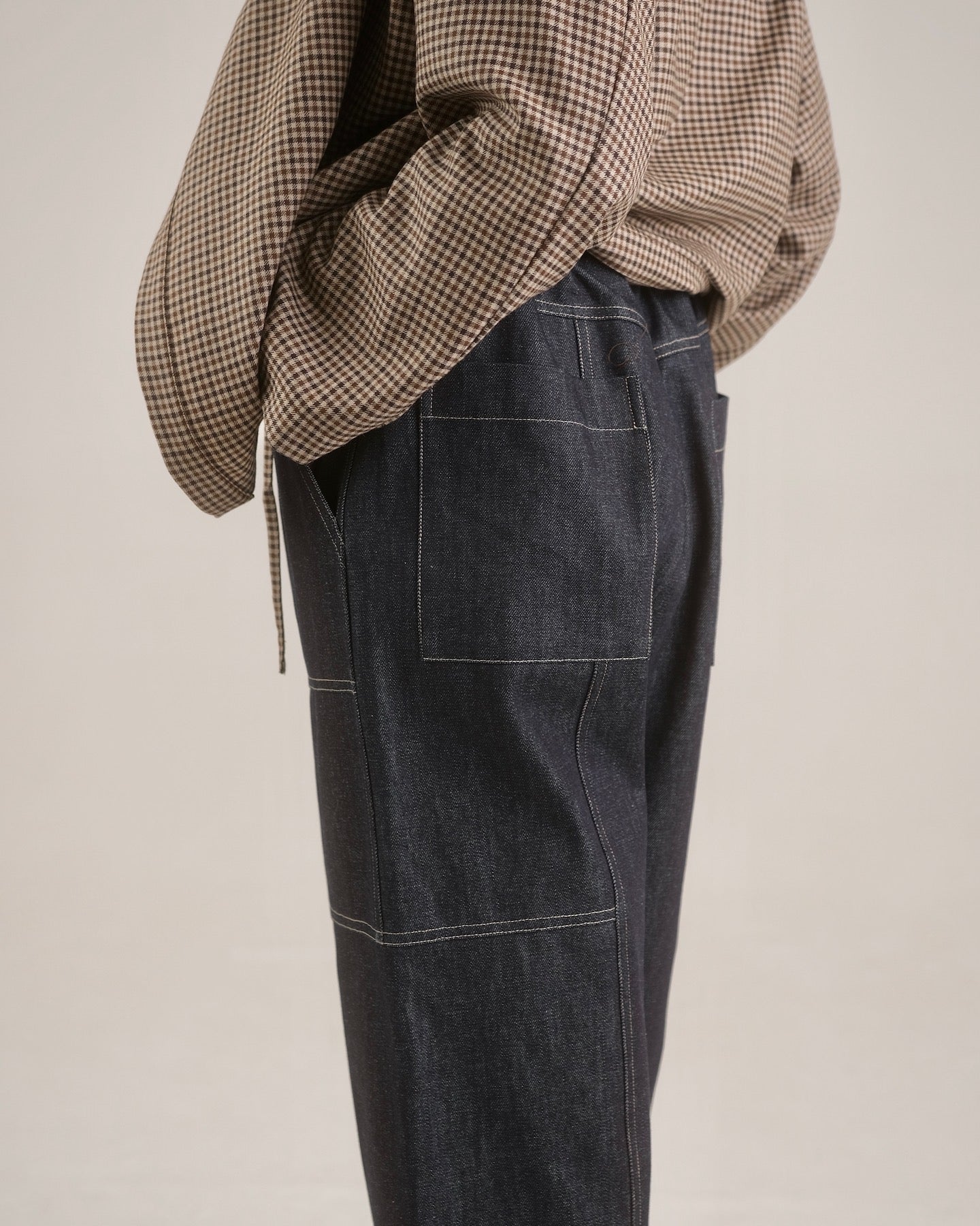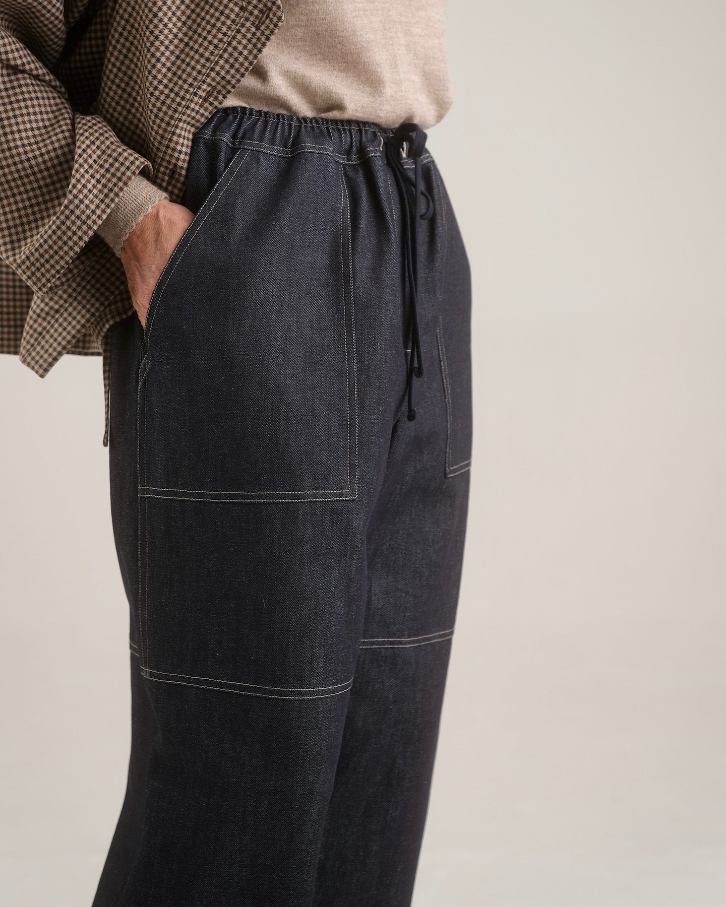Effortlessly blending structure with ease, the Garçon Pant is a modern wardrobe essential. Crafted from a stiff brut BCI denim, it features a relaxed, slouchy boy fit with sculptural ankle detailing and a flexible, elasticated drawstring waist for all-day comfort. Generous pockets and hardwearing top-stitched seams add practicality and durability, now in denim for seamless styling across seasons.
