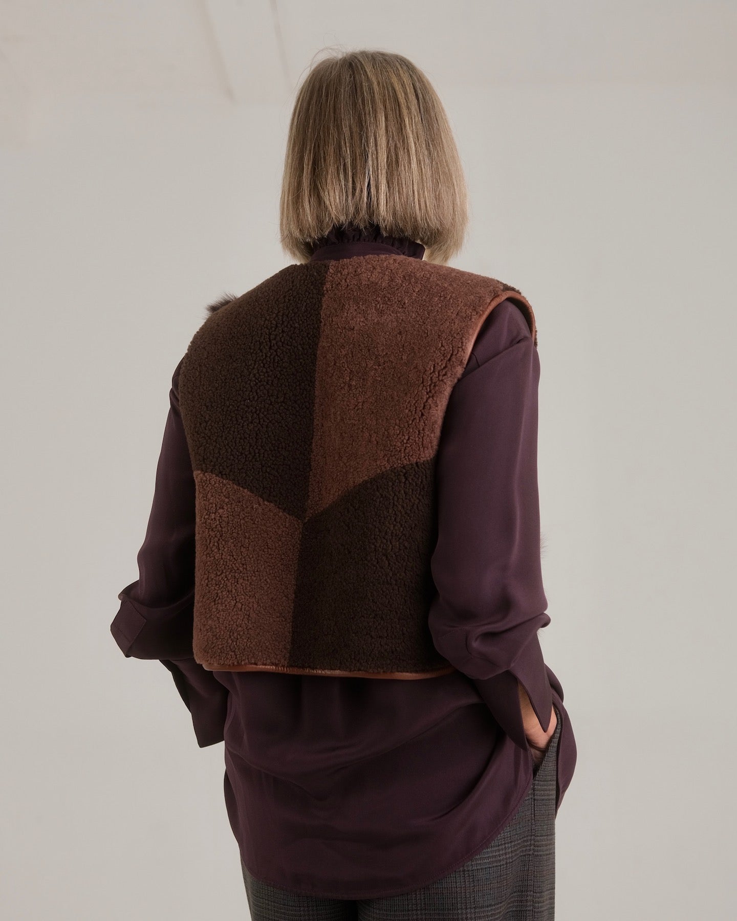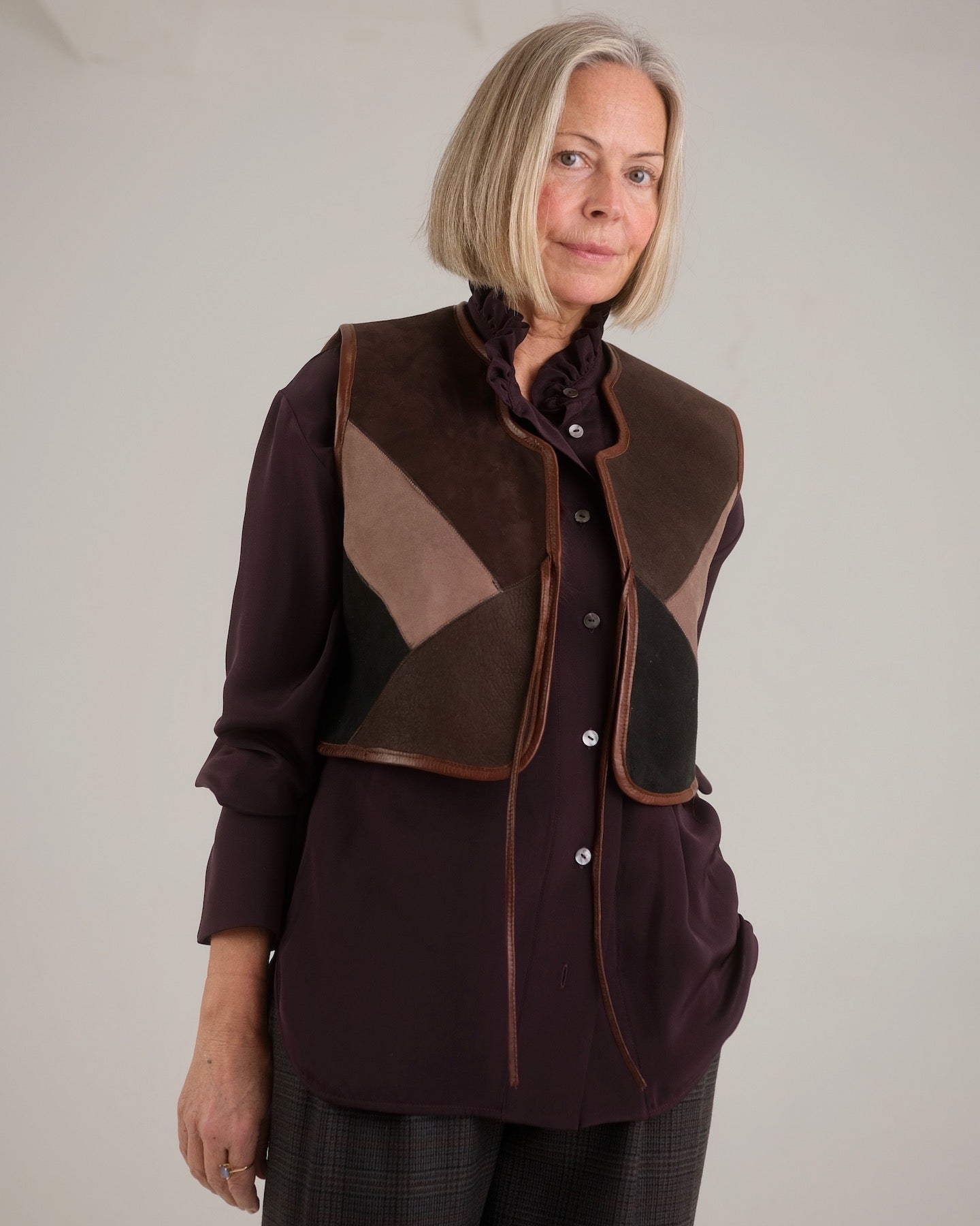 The Ara waistcoat in multi textural Bordeaux, features a scalloped neckline, with centre-tie and a patchwork of geometric shapes in merino and Toscana high mountain sheepskins. The reverse is a mix of various grey leather and suede.