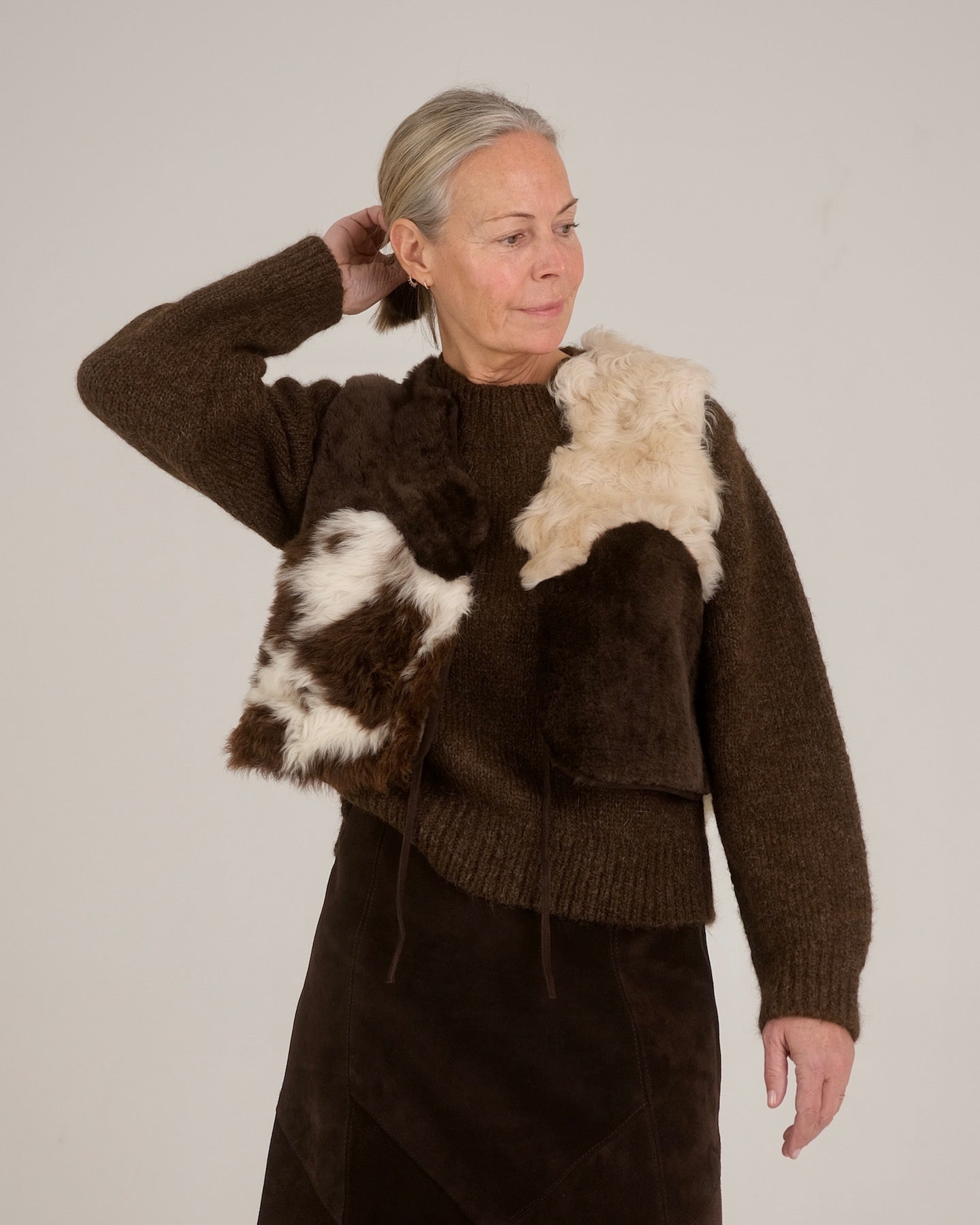 Materials: 100% Sheepskin, a bi-product of the food industry. In addition we use the perfectly imperfect overstock from the fashion industry, so no two pieces are ever the same. Some of the more heavily patchwork pieces are entirely made from off-cuts.
