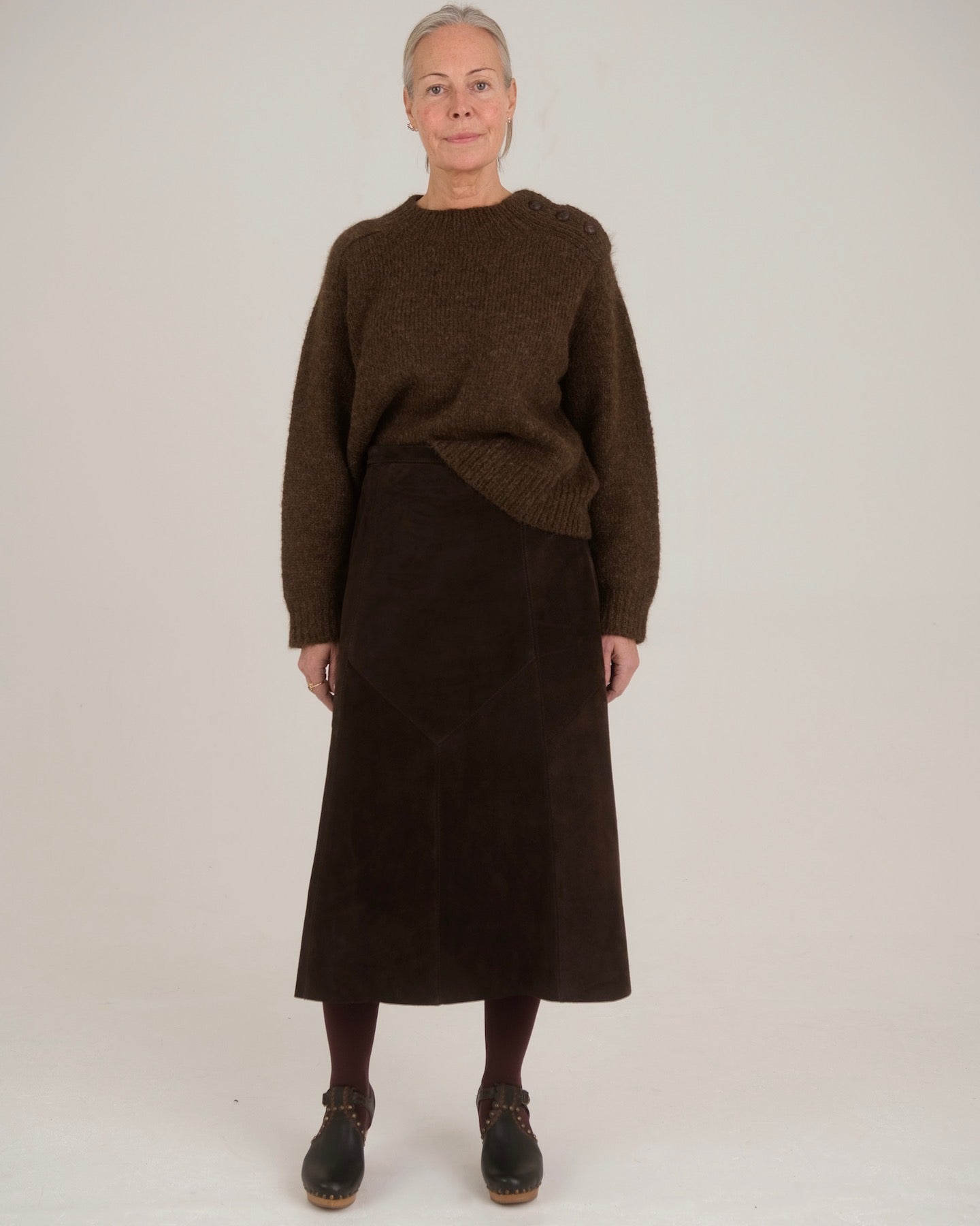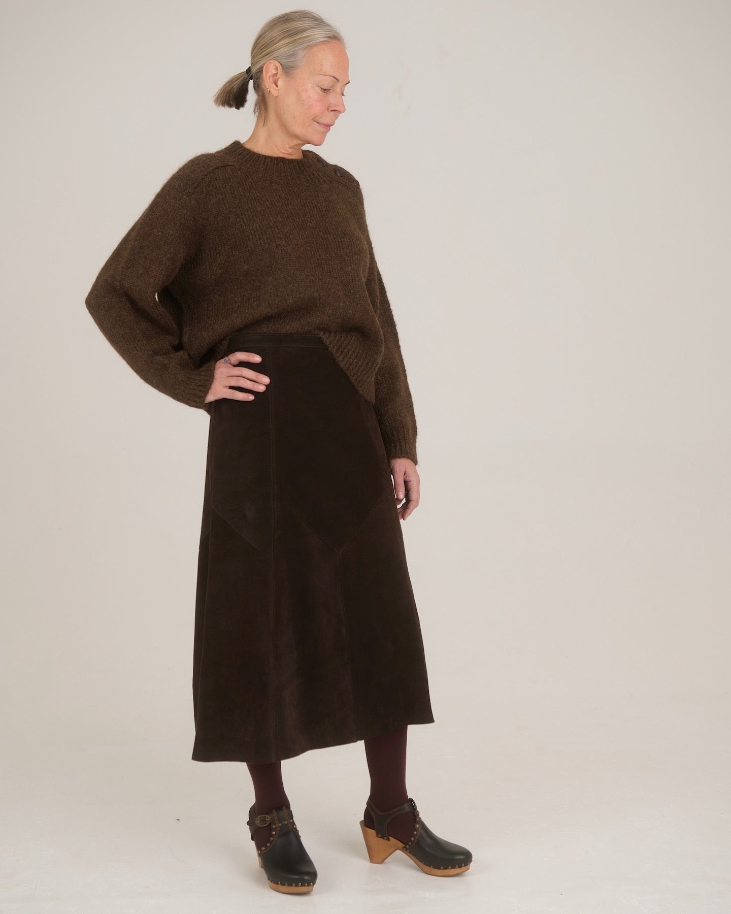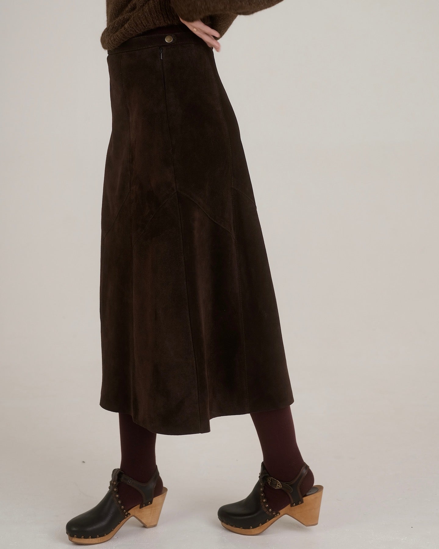 A nod to effortless ’70s style, this chocolate-brown suede skirt is crafted from a patchwork of symmetrical panels. Cut to a flattering midi length, it offers a sleek, elongated silhouette that feels both nostalgic and modern.