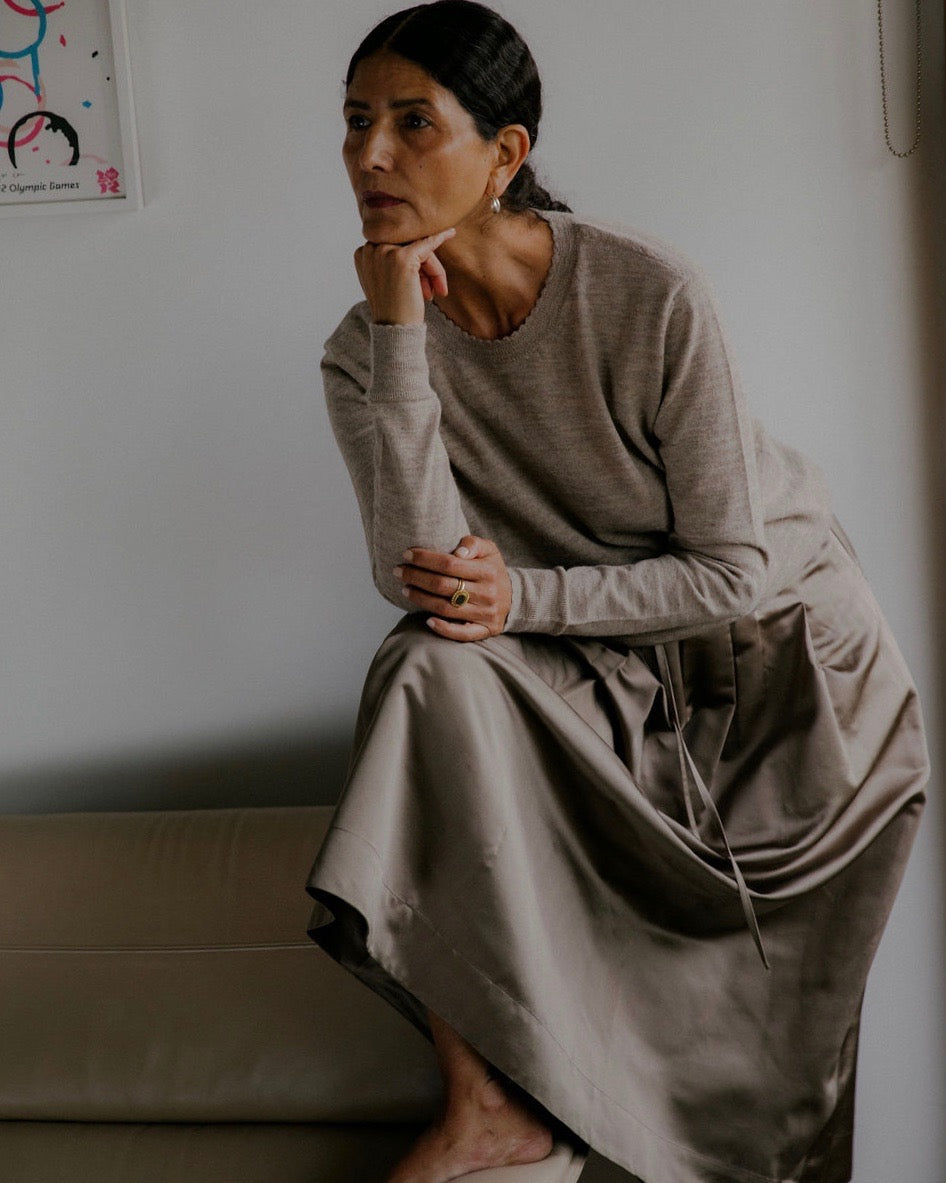 This Autumn we've reimagined the understated Suki skirt silhouette in a luxurious lichen silk satin.
